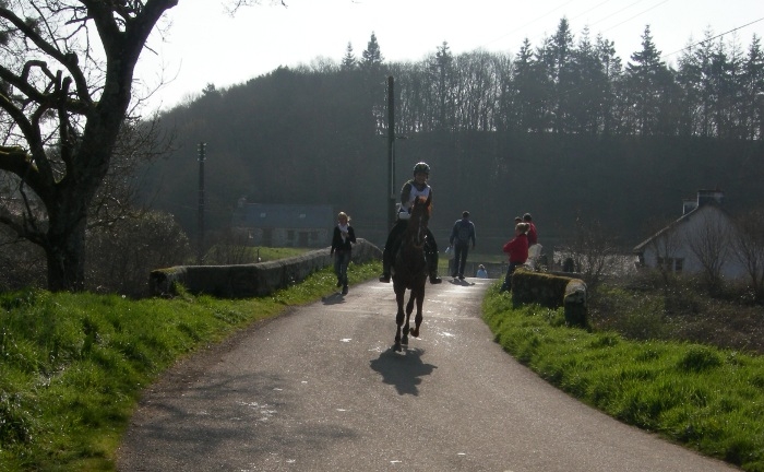 L'épreuve de 108 km : pour les habituésé : Le départ est donné en groupe. Le ciel nuageux promet quelques ondées, le vent est froid et violent. Il est 9 h précises. Le premier contrôle vétérinaire est à 16 km et William Giacomino sur Grillon le rejoint en 37 mn avec seulement 1 mn d'avance sur Barol que monte Denis Letartre, soit une moyenne de 26 km/h. L'allure est trop vive pour tenir 108 km au même rythme. Le terrain vallonné ne présente pas de grands dénivelés, mais comporte de nombreux tronçons galopants. Le second contrôle vétérinaire se trouve à 38 km du point de départ, à la fin de la première boucle du circuit. Les concurrents de tête ralentissent considérablement. W. Giacomino couvre les 54 km en 2 h 48 mn (21 km/h), à 8 mn devant D. Letartre. |