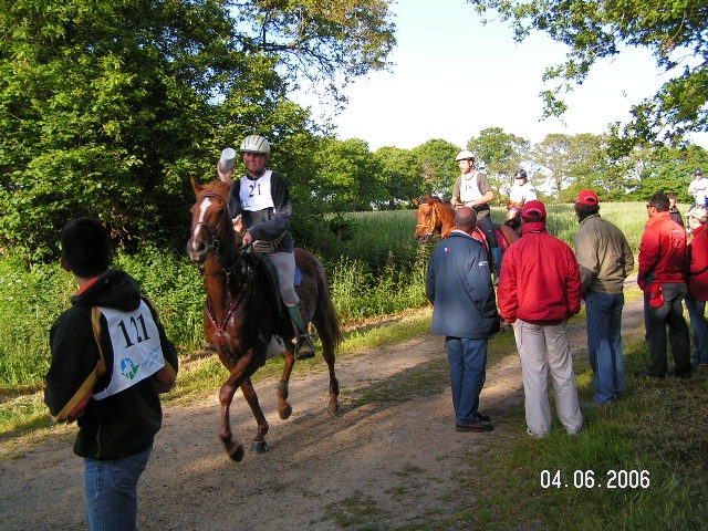 Les vétérinaires déceleront une "inversion" (rythme respiratoire plus rapide que le rythme cardiaque) chez Bimbo qui repartira néanmoins après avoir récupéré. Il reste 22 kms à parcourir et rien n'est encore gagné. Devant l'état de certains chevaux le Dr Granier décide de faire un contrôle volant à dix kilomètres avant l'arrivée à Chabrant. Certains cavaliers, non prévenus, seront surpris de se voir arrêtés 10 mns ou même parfois plus, afin de faire reprendre souffle à leur cheval. Le contrôle s'avérera trés efficace et permettra à un très grand nombre de concurrents de pouvoir finir la course. En tête jusqu'à présent, Gaëtan (Maurice Pradelle) accusera un coup de fatigue sérieux et sera contraint à ralentir considérablement son allure afin de terminer l'épreuve en 17éme position ! En tête, il ne reste que Tonnerre et Bimbo qui vont se disputer la victoire en une lutte effrénée. Alors qu'ils ne sont plus qu'à 1 500 métres de l'arrivée, ils pousseront leurs chevaux au grand galop sur un tronçon de goudron! grisés par une hypothétique victoire mais au détriment de leurs montures rendues fragiles par une telle épreuve. Ils seront encore côte à côte à 150 métres de l'arrivée, lorsque Tonnerre fléchira sur son postérieur gauche déjà fragile au départ et fera une chute spectaculaire devant un public déchaîné. Ce petit cheval parfaitement entraîné se relèvera en tirant légèrement l'antérieur droit. Il passera la ligne d'arrivée en deuxième position. Plus tard, les vétérinaires découvriront une déchirure musculaire. Bimbo, ce solide cheval aux origines portugaises remporte une victoire méritée prouvant la qualité de l'entraînement de son propriétaire Monsieur Chambon et une bonne technique de monte de son jeune cavalier Pascal Pic âgé de 15 ans. Lise Chambost terminera quatrième aprés avoir fait une course sage malgré quelques pointes de vitesse qu'elle avouera dangereuses. Voilà trois courses consécutives que cette cavaliére se classe quatriéme avec sa petite jument Kaline "origine inconnue" de 10 ans et qui ne présente aucun signe de fatigue (boulets, tendons ...). Denis Letartre finira cinquième avec Flambard un Selle Français qu'il sortait pour la première fois. Il fera une trés belle démonstration de technique de monte et de sagesse tout au long du parcours. Il perdra vingt minutes pour referrer lui-même son cheval entre la deuxième et la troisième étape. Francis Arnaud Sources : archives de D. Letartre |