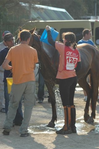 Pour savoir, on passe la main sur l'encolure, si elle est plus chaude que la main : on arrose ! Quand le cheval est revenu à la température de la main : c'est bon !