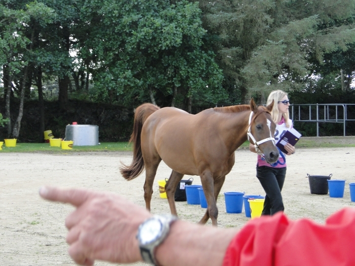 irrégularité antérieure : présenter le cheval avec la tête basse, devant les genoux, en baissant la main gauche. Se rapprocher du cheval (épaule).