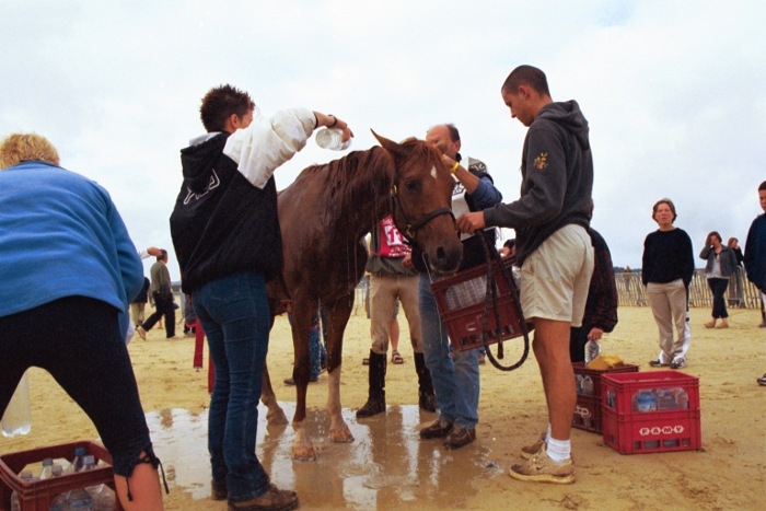 La plage est un excellent terrain d'entraînement, car il n'y a pas de phénomènes de rebondissements. Au galop, le pied se pose par le talon en une ondulation souple. Il faut que le mouvement soit un mouvement d'allongement. Le bassin ne doit pas remonter.